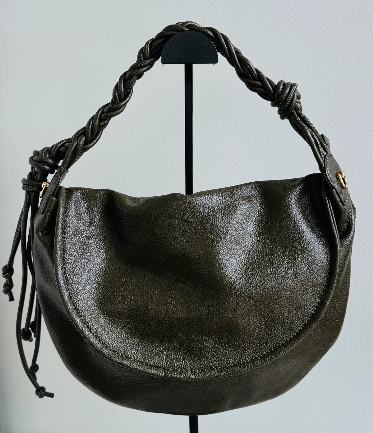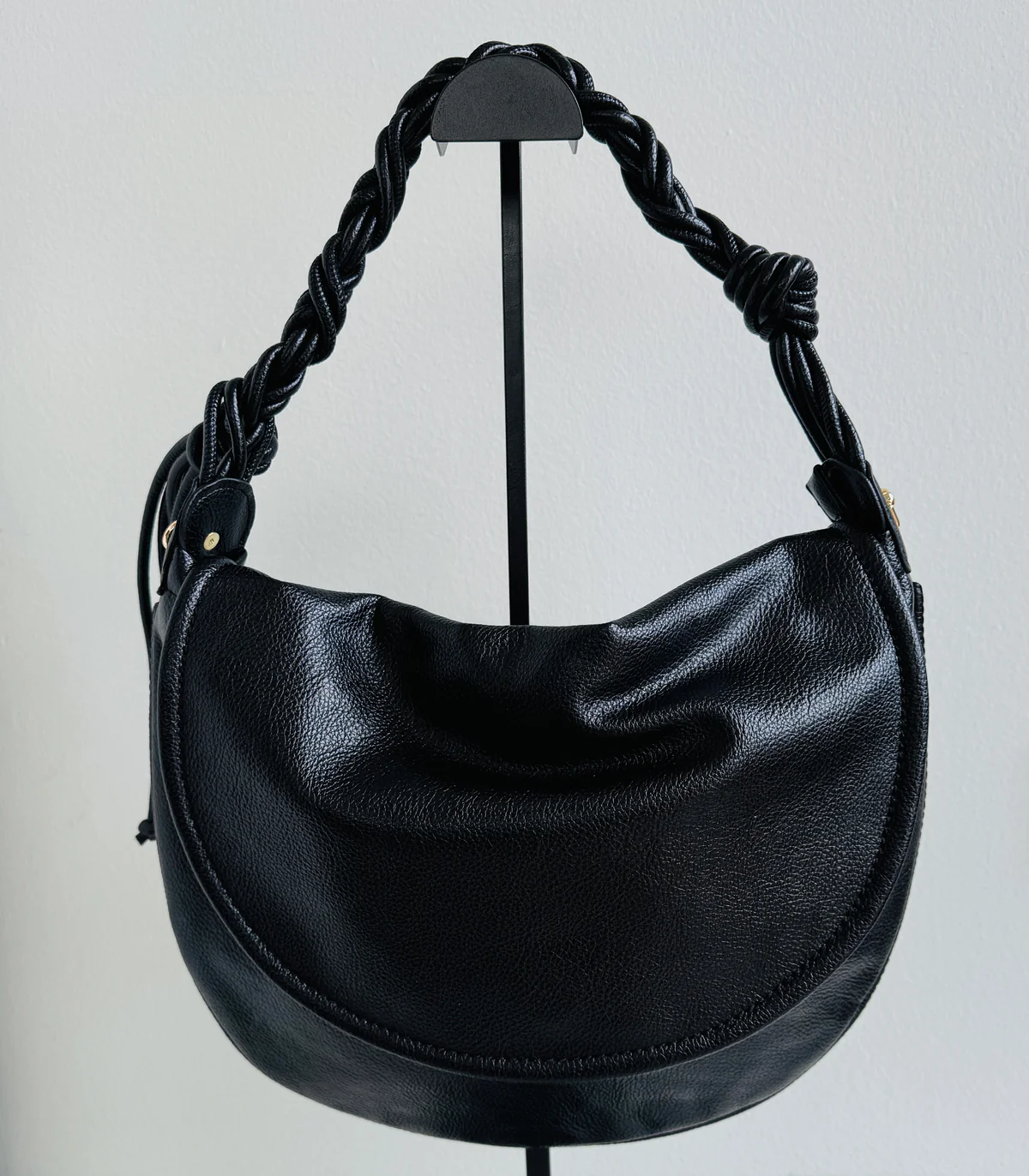 Half-moon shaped bag with snap button closure, shoulder strap, and removable inner shoulder strap. Inner pocket with zip and three other compartments of different sizes.